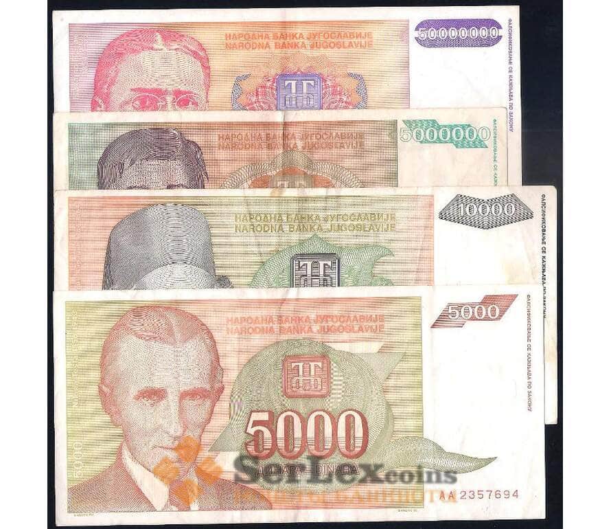 Банкнота Югославия набор банкнот 4 шт. 5000 динар -5000000 динар 1993 VF арт. 39680