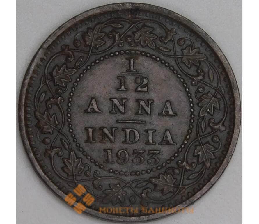 Монета Британская Индия 1/12 анна 1933 КМ509 XF арт. 5932