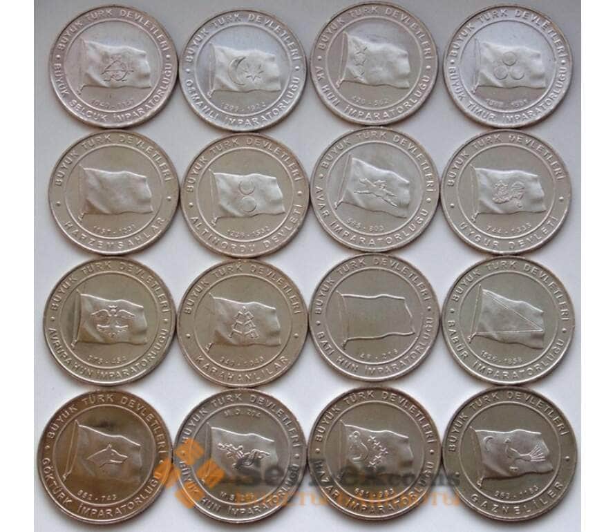 Монета Турция набор 1 куруш * 16 шт 2015 Тюркские династии/флаги UNC арт. С04464