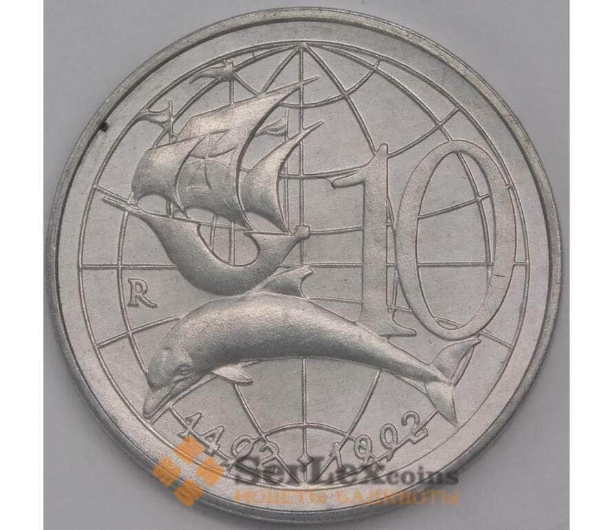 Сан-Марино монета 10 лир 1992 КМ281 UNC Открытие Америки